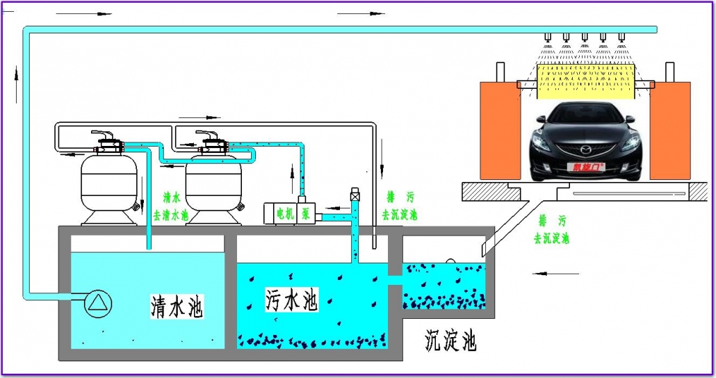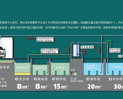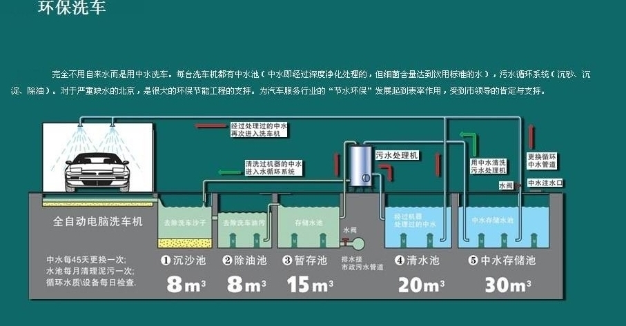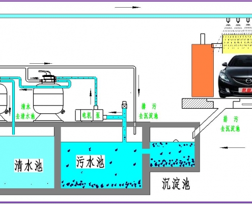 1.洗車循環(huán)水系統(tǒng)UItraCIean 在回收水方面將變得輕松經濟,洗車后廢水流入初沉淀池,大顆粒物體在此驚醒絮凝沉淀